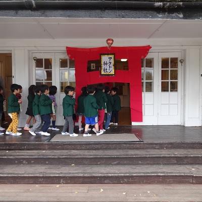 手作りの鳥居をくぐって、クラスごとに拝殿の前に進みます。