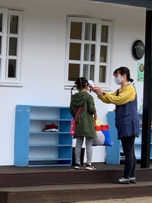 政府のロックダウン緩和によって、幼稚園も再開となりました。対象クラスは年長と年中組からとなります。ソーシャルディスタンス 消毒 手洗い 体温管理と安全に気を付けながら保育にあたっております。 初日には 日本テレビの取材も受けました。